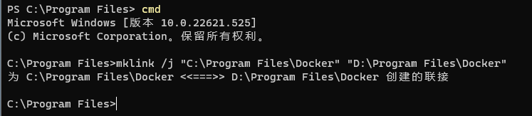 使用mklink软连接程序mklink /j "C:\Program Files\Docker" "D:\Program Files\Docker"